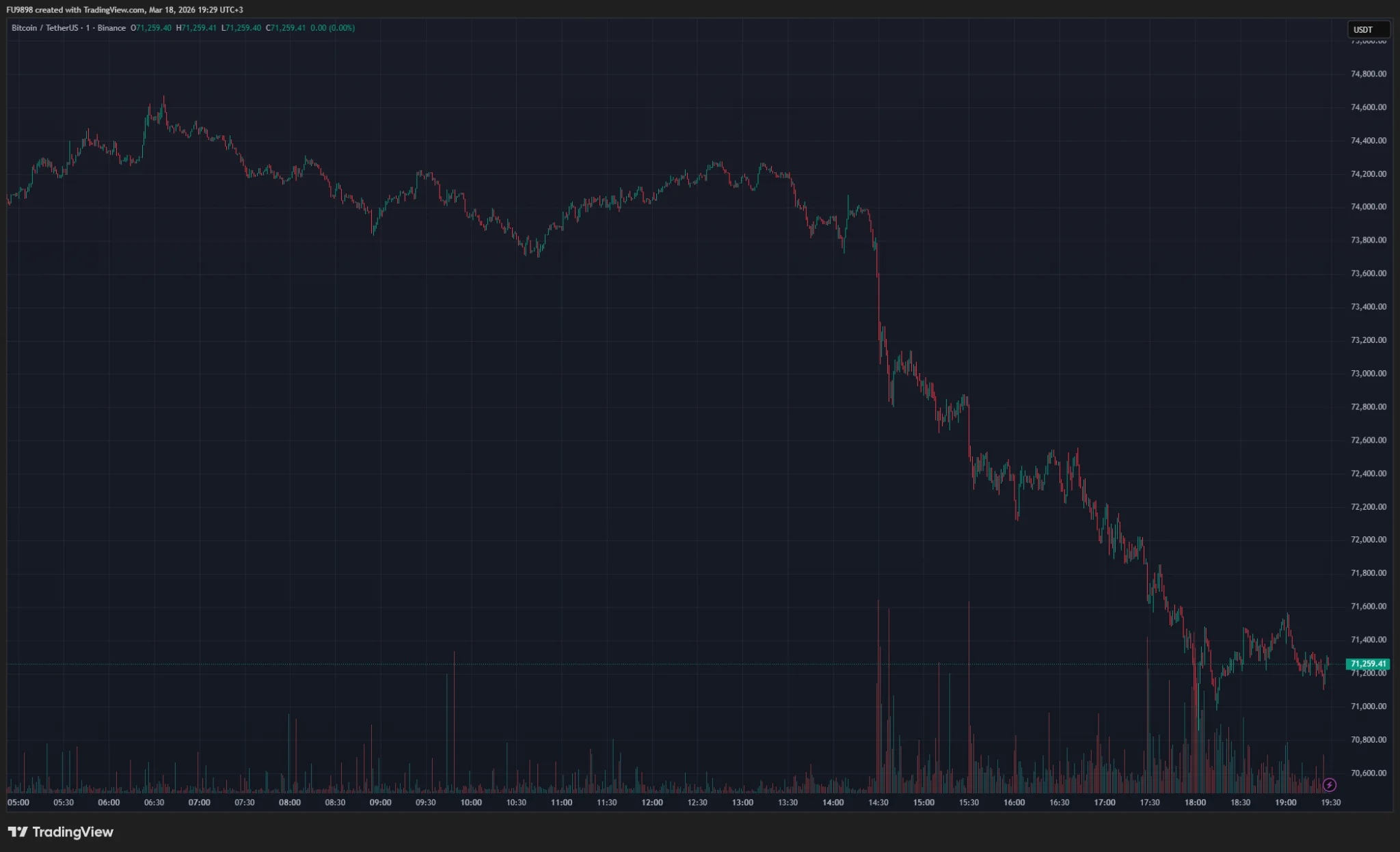 A chart showing minute candles illustrating the decline in BTC price.