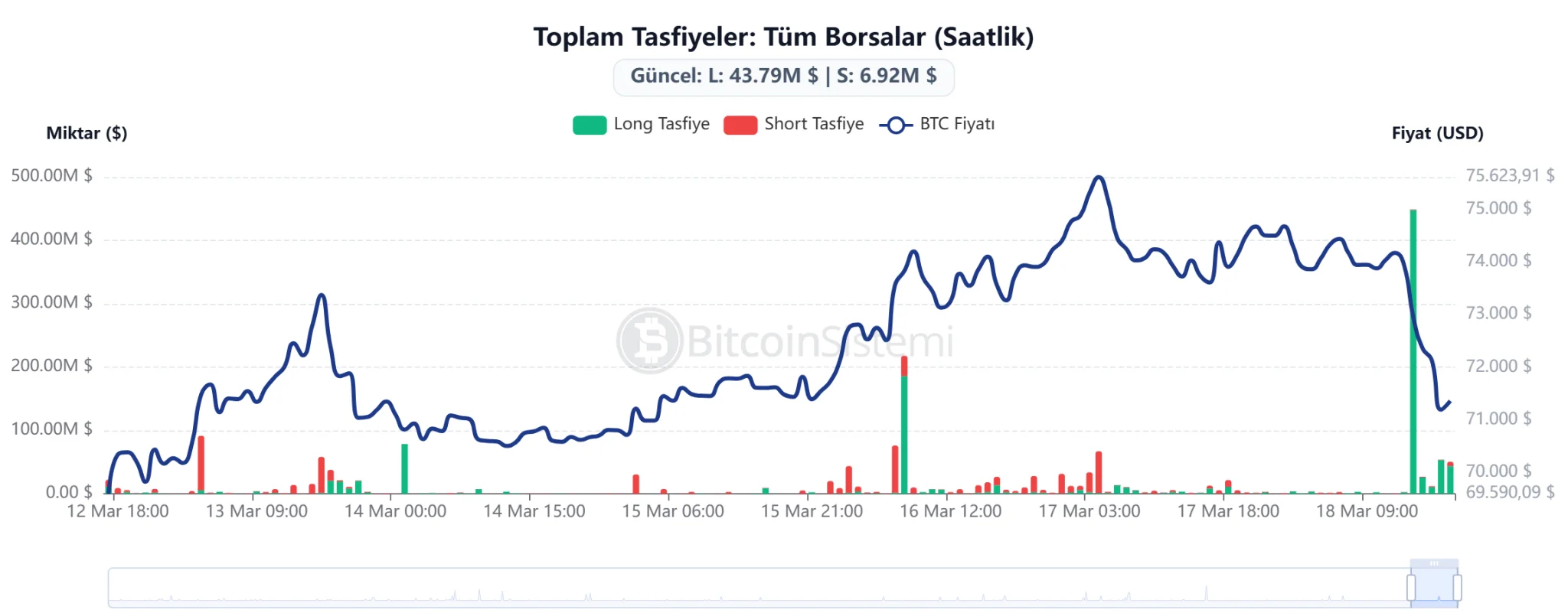 A chart showing the hourly liquidations in the cryptocurrency market along with the BTC price.