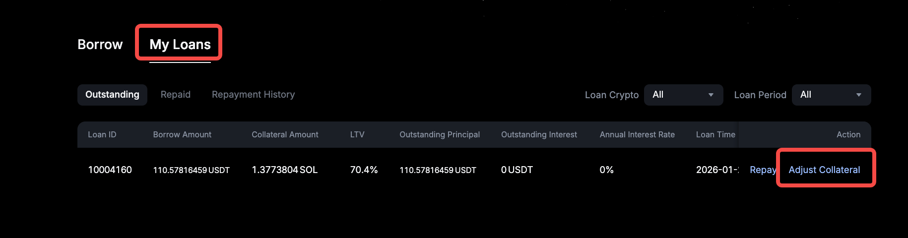 A: Users can add collateral at any time to adjust the LTV (you will receive a liquidation alert when the alert LTV is reached). On the MEXC Loans page, click on My Loans, select the loan order you want to adjust, and choose Adjust Collateral to add or reduce collateral. Overdue repayments will incur a penalty rate equal to 200% of the borrowing rate for the duration of the delay.