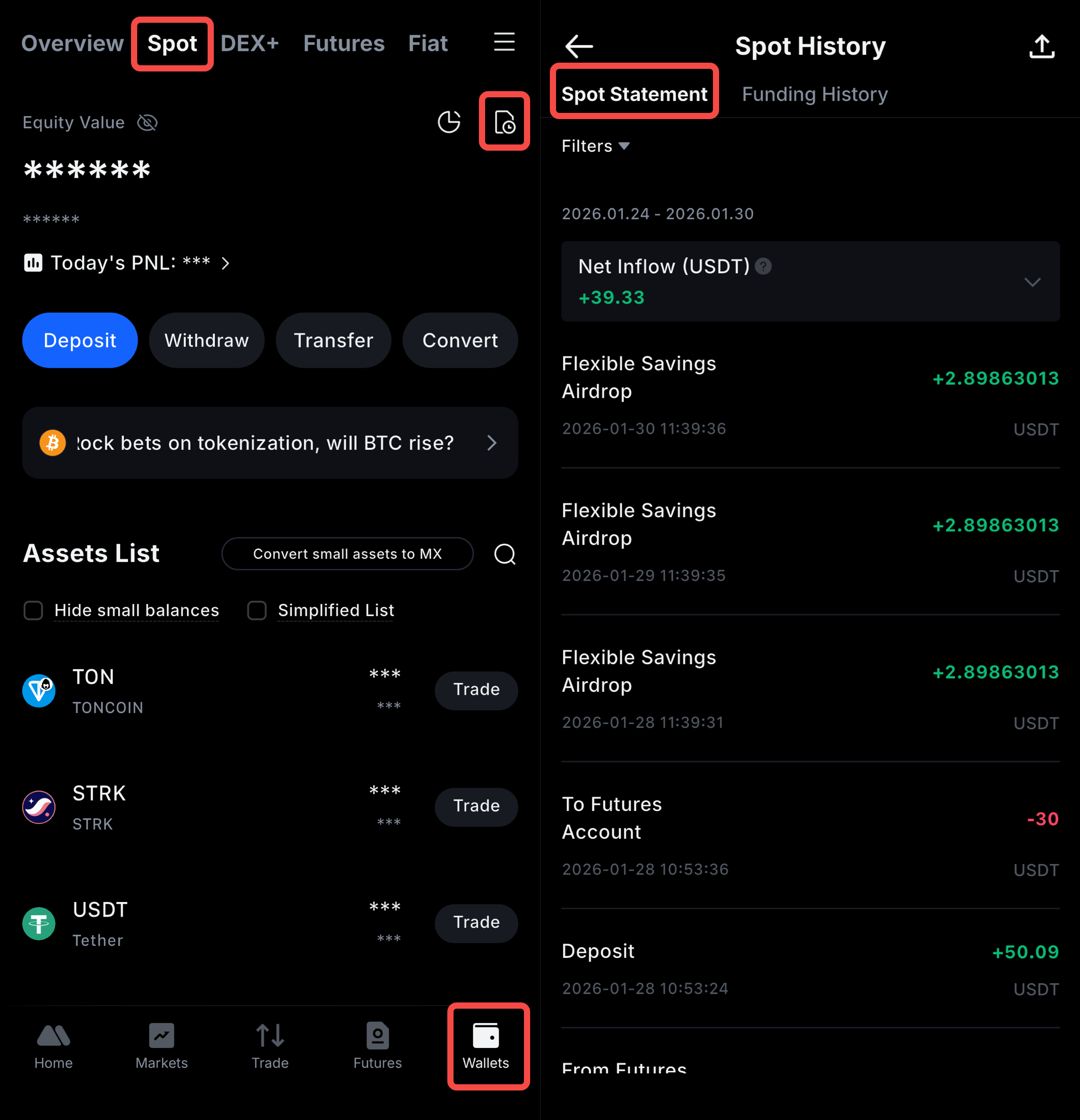 A: If you are using the website interface, you can go to the official MEXC website, click Wallets in the top right corner, select Spot, and click on Spot Statement to view the fund flow records.