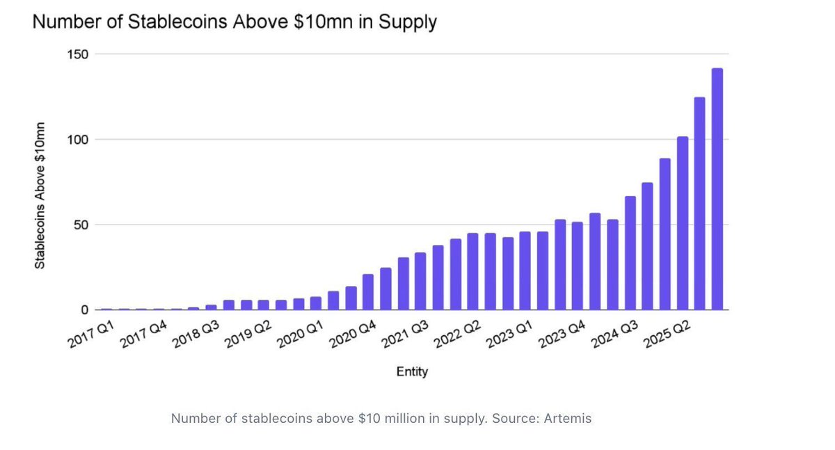 The demand that BVNK’s data captures has not gone unnoticed by the institutions racing to supply it. Artemis data shows that more than 140 stablecoins now have supply above $10 million, a figure that grew 89% in 2025 alone. The Artemis chart tracks stablecoin proliferation from essentially zero qualifying tokens in 2017 through a gradual build to roughly 50 by 2022, and then a near-vertical acceleration through 2025 into 2026. The pace of new entrants has not slowed.