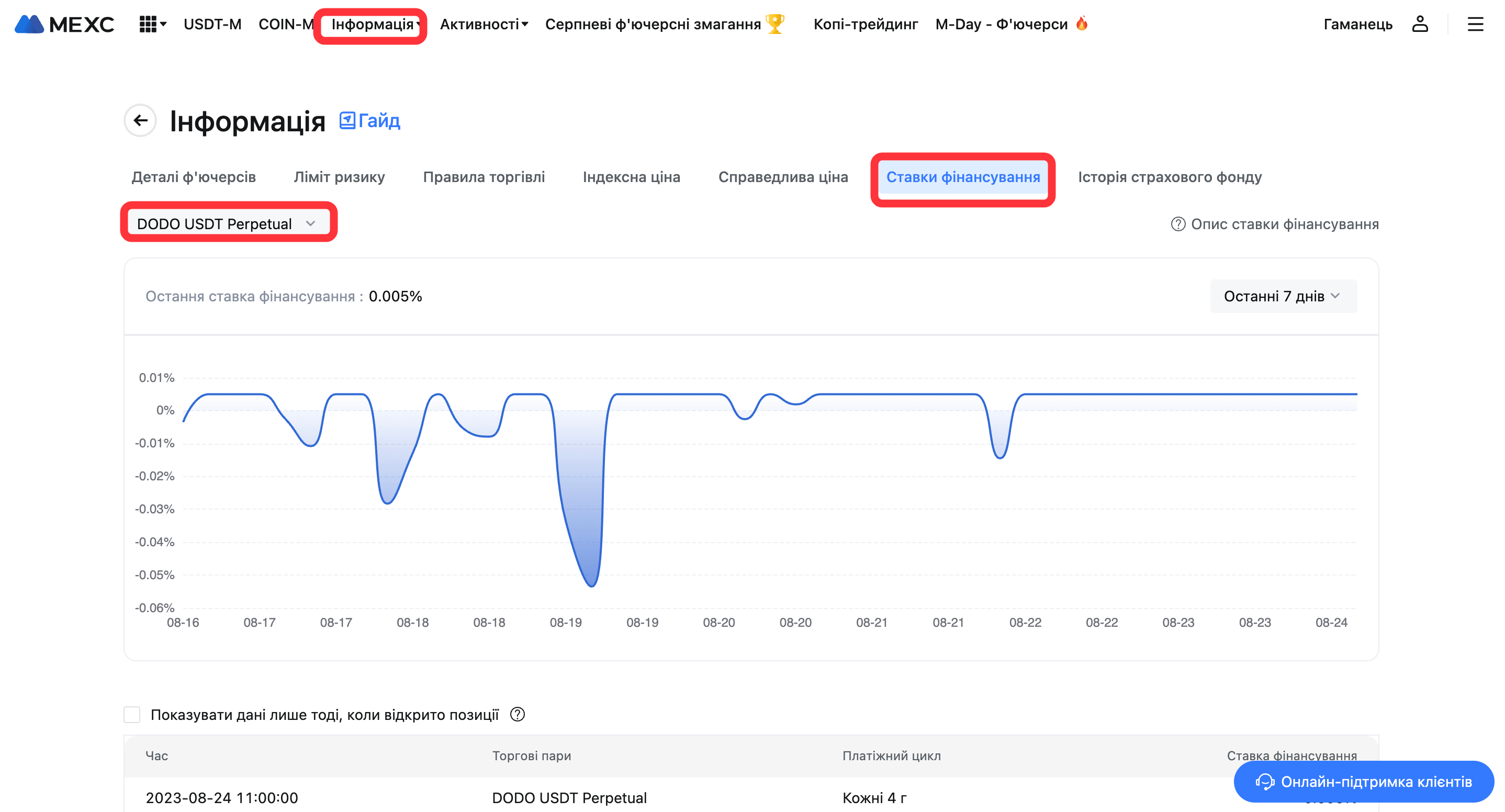 О 11:45, 24 серпня 2023 року (за Києвом), MEXC скоригує частоту розрахунків ставки фінансування для безстрокових ф'ючерсів DODO USDT-M. Нова частота розрахунків тепер становить один раз на кожні 8 годин.