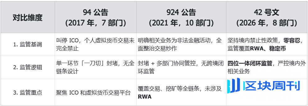 924 公告的监管范围仅针对虚拟货币相关服务,42 号文新增:「有关中介机构、信息技术服务机构不得为未经同意的现实世界资产代币化相关业务以及相关金融产品提供中介、技术等服务」,将监管范围正式扩展至RWA领域的中介与技术服务商。