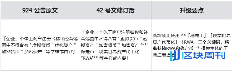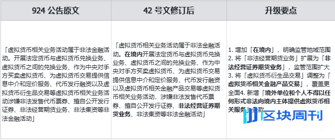 924 公告规定:「任何法人、非法人组织和自然人投资虚拟货币及相关衍生品,违背公序良俗的,相关民事法律行为无效」;42 号文修订为:「任何单位和个人投资虚拟货币、现实世界资产代币及相关金融产品,违背公序良俗的,相关民事法律行为无效」,将投资标的从「虚拟货币及相关衍生品」扩展为「虚拟货币、现实世界资产代币及相关金融产品」,监管覆盖更全面。
