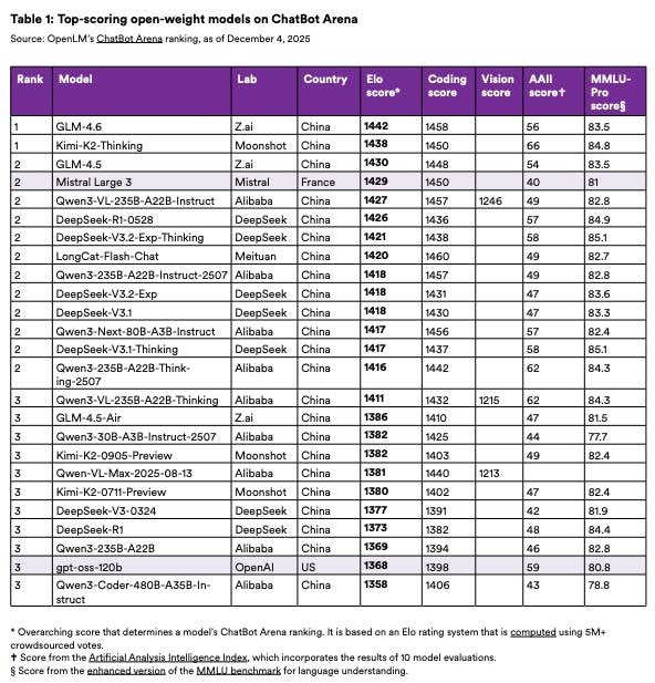 這些模型在性能測試(Benchmarks)中表現極為強勁。在知名的 Chatbot Arena 評測榜單中,截至 2025 年 12 月,中國模型如 Z.ai 的 GLM-4.6、Moonshot 的 Kimi-K2 等,與美國最頂尖的封閉式模型(如 Google DeepMind、OpenAI 的產品)幾乎平起平坐。
